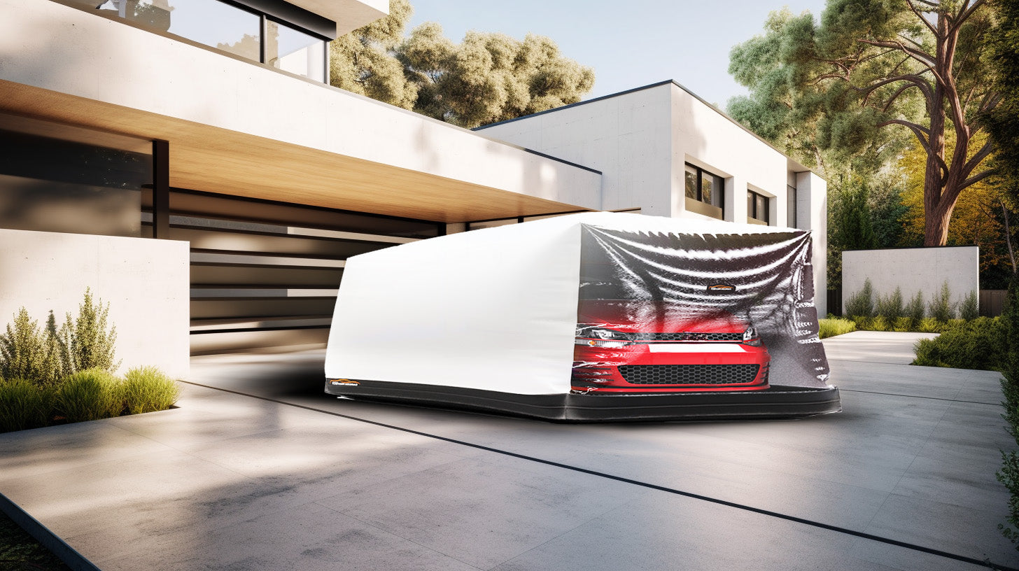 Die Garage wird mit einem Gebläse aufgeblasen und bleibt durch konstanten Luftdruck stabil. Sie schützt dein Fahrzeug vor Staub, Feuchtigkeit und äußeren Einflüssen – einfach aufstellen, anschließen und dein Auto ist sicher untergebracht